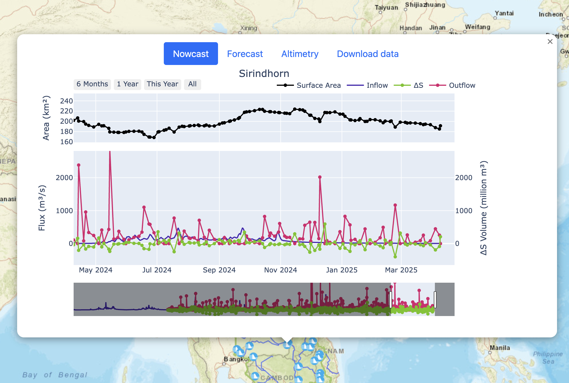 From the homepage showing the map (left image), select a reservoir of choice. Once selected, a pop up will appear showing it’s fluxes–Inflow, Storage Change (∆S), and Outflow–and the Surface Area (right image).